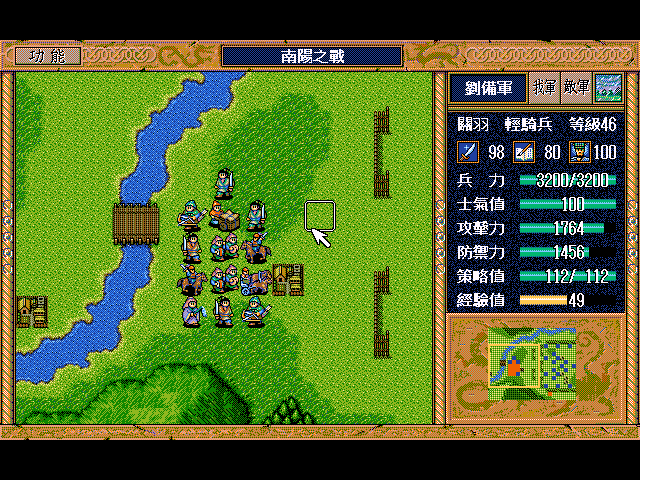我1995年这游戏刚出就打穿这游戏4次了,最近发现了这里的众高手,参考了他们的打法后也重新玩,按我现在的进度可能能打出18-20个99吧.刚打完了博望,我迟了一合放火,第7合放的,就是说关羽他们只动了33回合,这关感觉随机性太大了,不SAVE LOAD的话好难控制,我是参考土狼的办法的,刘关赵云赵何4个人冲过去利用敌人军乐,其他人在村庄那边利用骑兵和傻瓜武术家,最后引夏侯过来给刘封和诸葛亮打.刘封这关可以重23直接升到31.如果不SAVE LOAD 冲过去的那4人就很悬了,因为又要牵制失败,又要让刘封吃人快速升级.我SAVE LOAD了很多次,周仓一出来那一下还是亏了一个回合........我也不是疯狂玩家.....所以也没很追求极致.刘封这关最好拿方天,方便吃人.