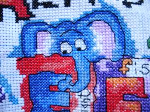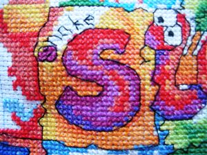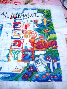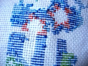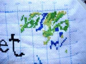 我考虑了一下觉得要是按照以前的想法,等都绣完了一起勾边,很有可能有哪部分没注意就没勾上的情况出现。所以改变了一下方针策略,决定还是从角上开始绣好了。不过其实是,左上角已经绣好一部分了,右上角几乎没怎么动,但是整个右半部分的进度要远远快于左边。所以考虑了一下还是从右上角开始好了。