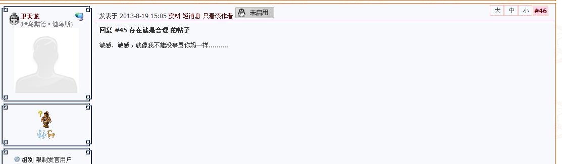 我无法证明我正当,甚至我不得不承认我的“提醒”带有挑衅意味,我没兴趣谁的好感,用不着拿这玩意威胁我,本案中的不同认识,完全是由“存在就是合理”隐瞒一帖,故意隐瞒自身被我回复那句的挑衅意味而造成