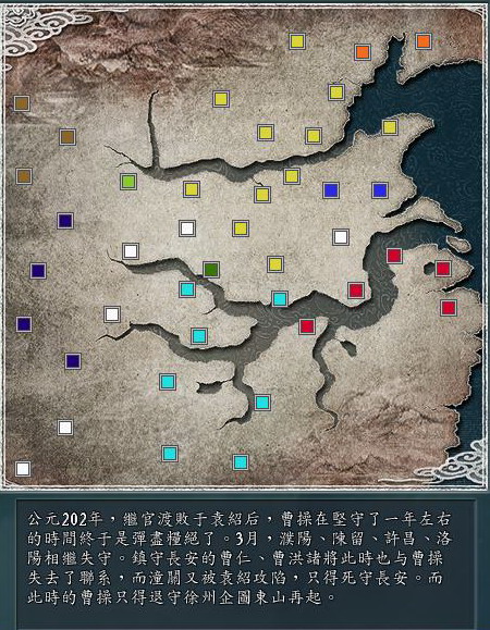 略为修改了一下,对袁绍的外交关系改了一下,追加了一个汝南给袁绍,这样袁绍就和刘表等接壤。曹仁的势力没做修改,本想把曹仁划为曹操的第二军团比较合理,但想这么做,玩家也可以放弃长安,这样就起不到作用了,所以仍保留着。