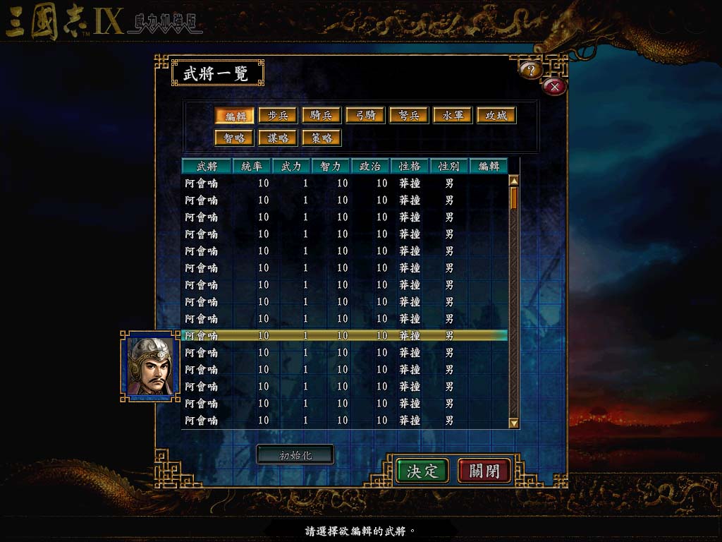 .....樓主JJ是B是用瞭東方無翼大大D劇本修改器,把同樣D武將移入南蠻建寧等地再移出,偶記得這樣子就會所有武將都變成阿會喃