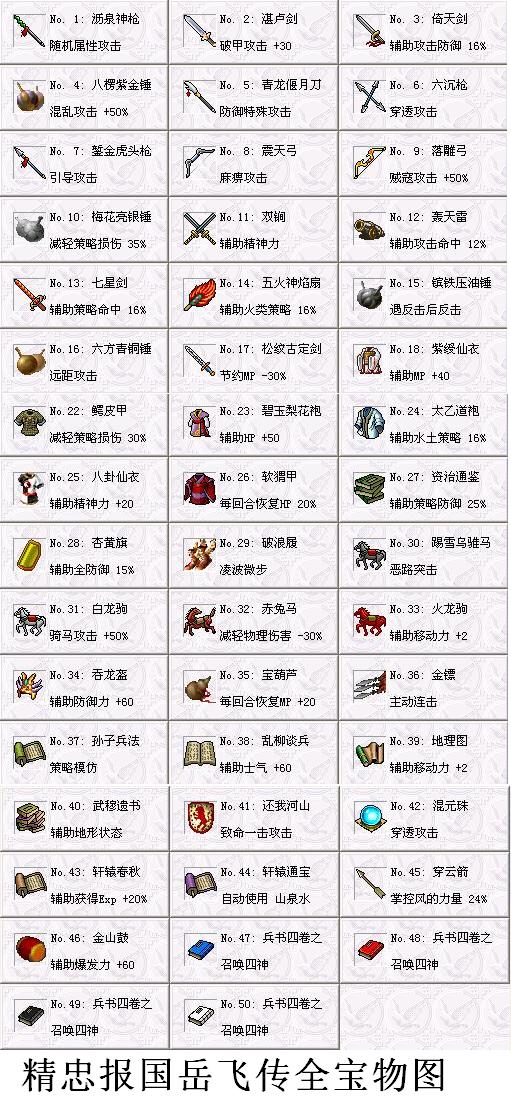 ★ 可选装备:沥泉神枪、湛卢剑、倚天剑、錾金虎头枪、落雕弓、梅花亮银锤、双锏、轰天雷、紫绶仙衣、紫金铠、玉砌连环铠、柳叶甲、鳄皮甲、碧玉梨花袍、八卦仙衣(选择装备需消耗功绩。以上装备默认为9级。如不选择,则为默认普通装备);团牌、狮子盔、护心镜、手套、诸葛巾(选择以上辅助装备不消耗功绩);资治通鉴、杏黄旗、破浪履、踢雪乌骓马、赤兔马、火龙驹、吞龙盔、孙子兵法、乱柳谈兵、穿云箭、金山鼓(选择以上辅助装备需消耗功绩)。