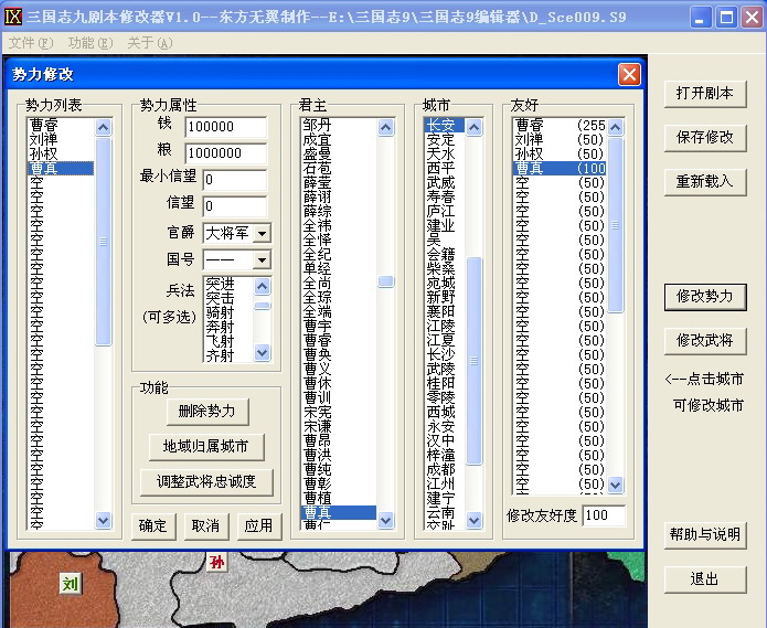 我也想知道怎么改,今天下了从风的汉中剧本,用修改器打开一看曹操势力分成了好多军团,每个军团在修改器上看是独立的,但进游戏后却全是从属于曹操,不知道是怎么办到的