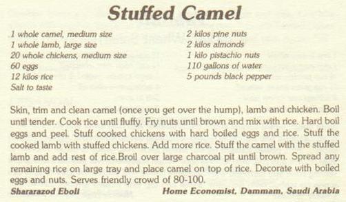 烤全骆驼。简单的说,把60个鸡蛋放到12只鸡的肚子里,把鸡放到羊的肚子里,把羊放到骆驼的肚子里。除了肉类/蛋类之外,肚子里还要填大米、松子等谷类。然后,拿到火坑上烤。。。供80-100人享用。
