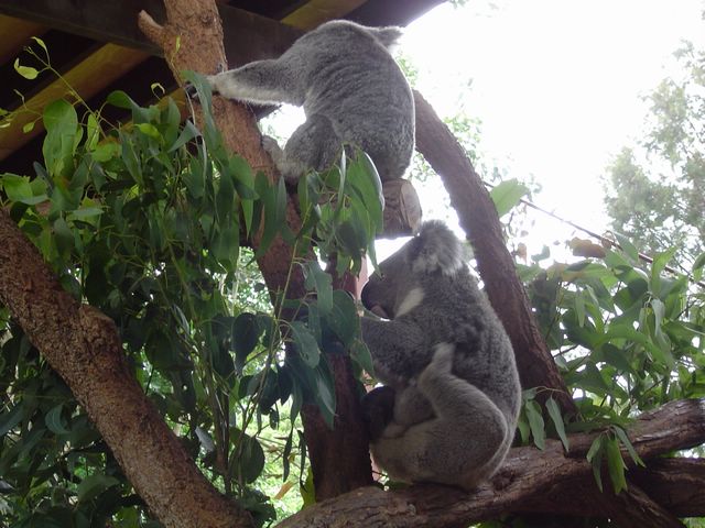 这两只考拉碰巧没在睡觉,很活泼,赶快抓拍了,其中下面一只还在挠痒痒