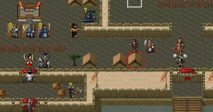 接下来注意岳飞一定要在后面等着,这是关键的关键。岳飞一冲,敌军就会出现,这么多人堵在路上无论如何都不可能过去了。经测试只要岳飞不过了城门左侧的那个小房子(如图红圈),敌军就不会出来。其他人过去多少都没问题。因此岳飞等在后面,让岳银屏和李琴杀过去吧,把贼兵、炮车、弓兵守城门的步兵都干掉,下面严成方和诸葛英也可以干掉几个弓兵。扫清道路。时间充裕又简单,可以随便打,到18回合已经清光了。