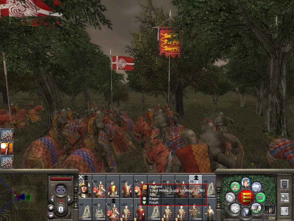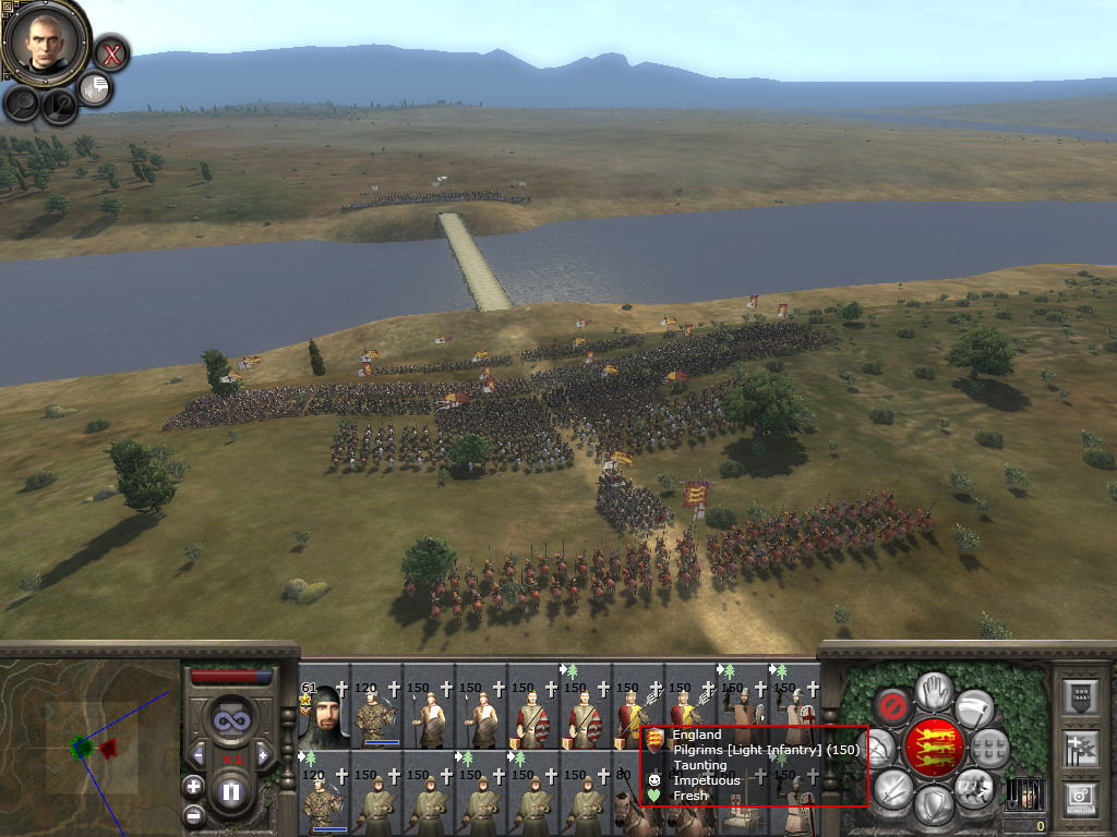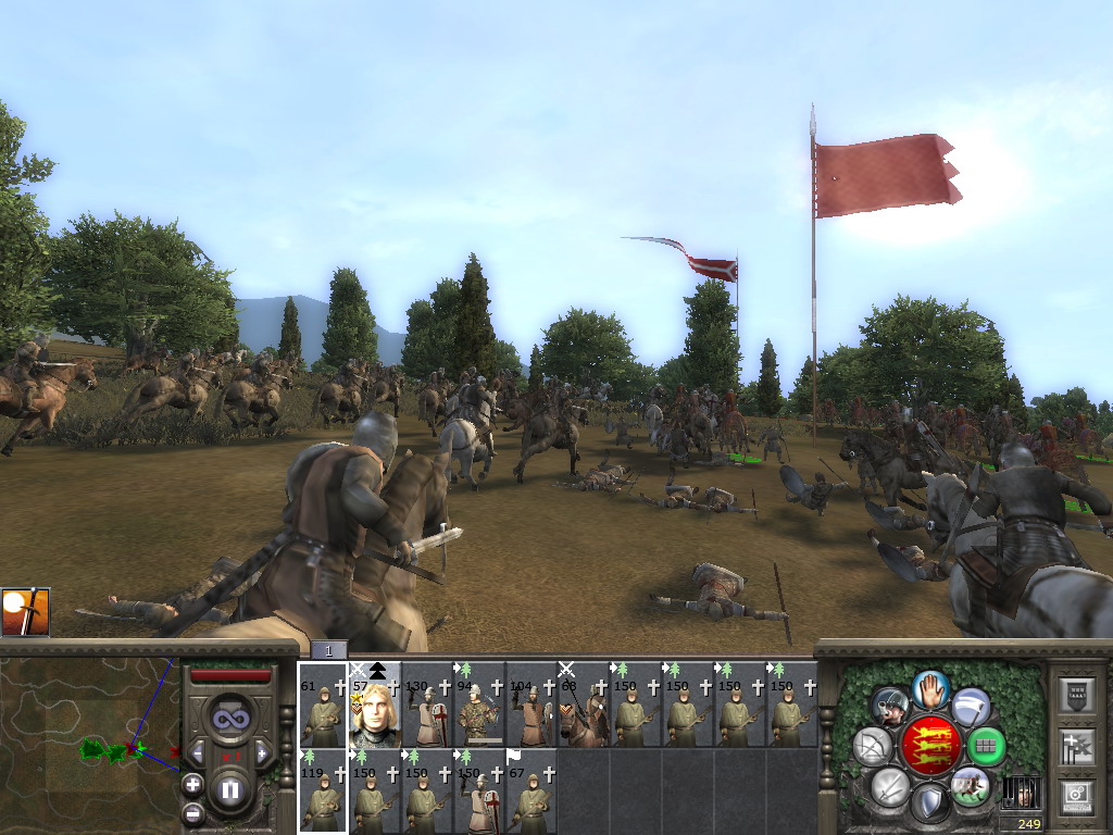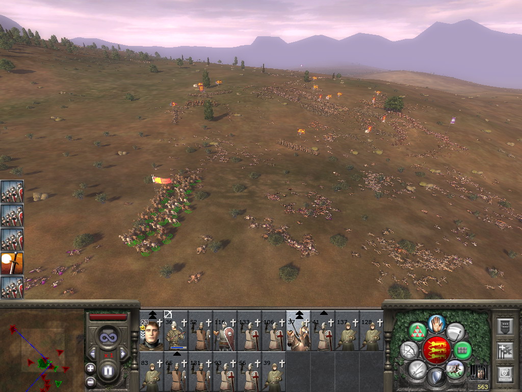 简要说一下:作战时左下角就是雷达地图。其中红色代表敌,蓝色代表我。星状代表将军所在,其他部队可以根据其箭头的朝向了解到其行动或面对的方向。在雷达地图的右边有个长条,是战力对比与胜败估计,战斗时鼠标移上去之后才会有所显示。红色越多表示在战场形势越有利于我方,可以看与威尼斯的米兰之战中几张图那个红条的变化,与法国的也是。很可惜的是与拜占庭那仗对手倒是很强,只是因为全神贯注于战斗,等到快结束的时候才想起来截图,于是截到了几张追击图……