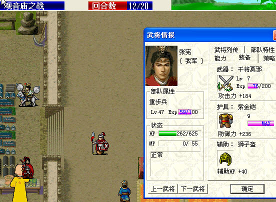 第2回合:上面岳飞争取使用特技,叫出李琴。岳飞救自己,诸葛给何加能力,何张攻击敌人。敌人消灭的差不多后,何、岳飞先后向下,剩下的交给李琴和张宪(也得保证他们能干掉敌人)。后面要拿兀术营寨的东西,得保证有一个小兵先不被干掉,张保王横出来后不回去,容易捣乱。