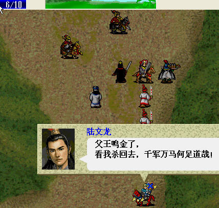 下面,于射住营寨出来与张显并肩的小兵,在援军过来前不要主动攻击他,由他和张显堵住营里面的敌人。通常会有几个骑兵进营后,又从下面出来,由于化龙过去射住并在牛皋得配合下消灭。
