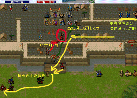 最后一次,很幸运,前几回合张保勇敢的生存了下来(药补或经验果补,不要主动攻击),成功的堵住了门至少7个回合左右。与此同时岳银瓶与母堵住中门(王横事先堵住桥打晕冲出来的敌人,再右跑)重点打击4个弓箭手,如不能“不战自溃”,就吸血,李琴一次255点左右,而YYP只得98点左右,重点用火龙,如天气不允许就只得吸血。此时岳飞(三人中途不要补血,补了也白补)、欧阳善(主要是后勤补给)等已跑到右上门附近束手无策。李琴灭掉弓箭手后转身后撤(与此同时张保也后撤,利用太学士阻击追兵,此时中门已无敌军),打击右上门守门兵--娘俩一起“不战自溃”。天气不允许就让YYP带“孙子兵法”(观全站,几乎必须)站在周三畏身边“开天见日”。同样的策略一直贯穿全战。周三畏死后有九成或诸葛解决天气问题,无须担心。富贵有命,生死在天,就是想管管他,也没办法,任其去吧。