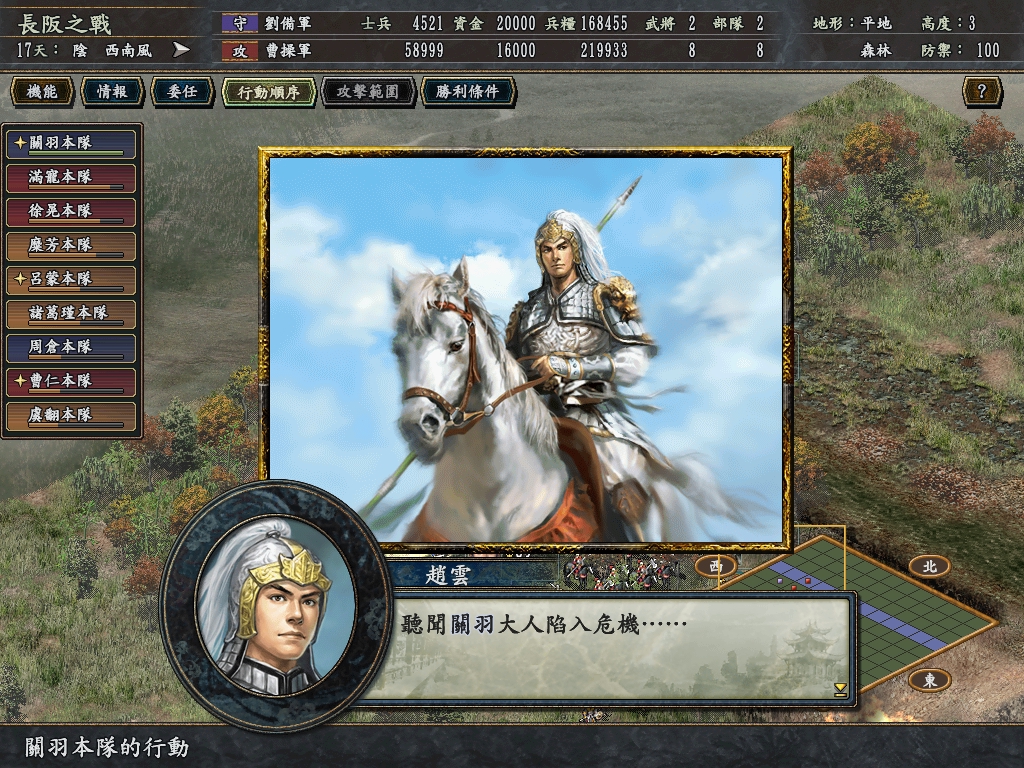贴个荆州攻防战挨17天的图,我这次连鼓舞都没用,单挑也没用,关键是出了水淹七军的剧情,没了于禁庞德,曹仁满宠剩一队就好打多了,满宠开始被吸引跟着关羽那边过河,看来用关羽的位置来控制敌军的走位是可行的,关羽尽量伏在大片树林的东北边,就是靠河悬崖上远离地图边缘的那些树林里,就能吸引敌人从城塞那边攻而暂时不包抄,最后被越逼越后推到边缘,陆逊才坐斗舰从后面包抄,但那是已经17天,援军来了,可惜挂了关平