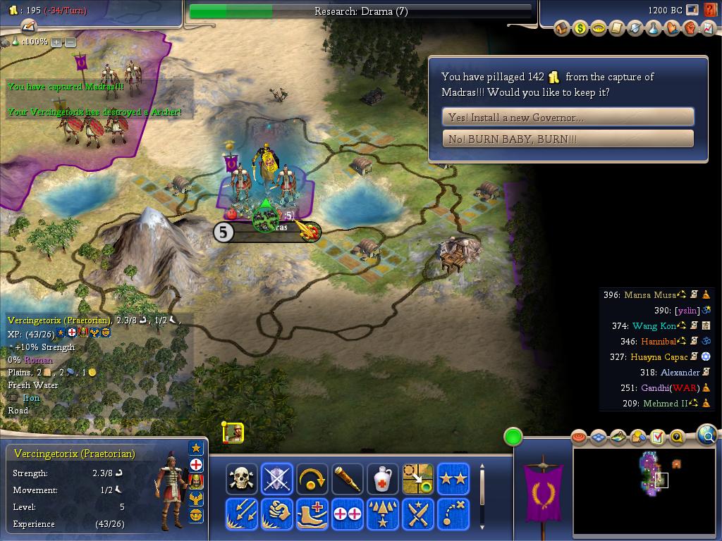 BC 1600 第一位大军事家维钦托利在罗马出现了,但是4个禁卫军都在万里之遥的南方前线作战,还得飞奔过去附身,真麻烦啊。。。