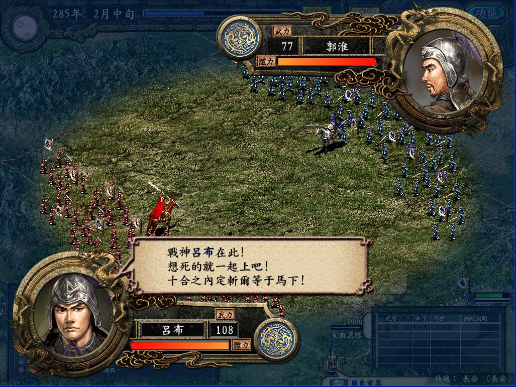 正当偶忙着征兵的时候,马腾和刘焉已经打的不可开交了。先是马腾带了4W人去打阳平关,结果被刘焉打了回去,刘焉顺势将屯了21W兵的汉中人马倾巢出动(留了4W),去攻打马腾8W人的天水,结果自然是马腾败北,而此时天水耐久只有100多,于是,我又用对付乌丸的方法对付刘焉,被偶白赚7W的生力军。为了南征,西北的马腾和羌军是必须清除的后患。于是吕布,张虎各领一军攻打西平。而武威的援军立刻出动,武威空虚,无奈安定离武威差不多1个半月的路还是让偶打消了奇袭的念头。而西平城下,两军陷入了苦战,马家军的突击,秦军的飞射都威力无穷,张虎队兵少,一番恶战后只剩4K人了。此时偶突然心生一计:令张虎奇袭武威,若西平不增援,则武威可得;若西平增援,则西平可得。于是西平到手。要问秦军如何取下武威,且听下回分解