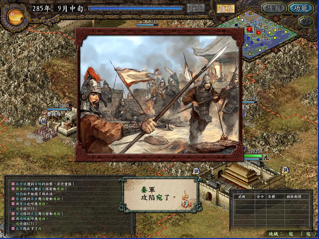 挡住了曹军的进攻后,秦军将安定的10W新兵全部运往长安,宛城;将上党的86K中的7W,晋阳的4W全部运往蓟和北平。这时发生了一件非常好笑的事情,襄平袁绍在柳城建阵想攻击偶的北平,而乌丸也出兵2W来攻打北平,结果半路上两家自己打起来了,死伤惨重。这时袁绍再次从平原出兵攻打濮阳,被偶轻松剿灭。袁绍从平原的进攻很麻烦,通常都要抽调很多人去迎敌,于是派魏续等人率3W兵马占领高唐港,这样袁绍就无法再骚扰濮阳了。曹军的许昌4面被我军包围,于是派遣吕布领35000兵马去攻打。这次攻城非常的失策,我没想到曹军居然出了三个文官陷阱团出来打我,以致中了3次陷阱,不过幸亏抢在敌军援军进城前攻下了许昌(其实敌军一共5w,出来3W5K,里面的1W5K被偶4个飞射解决,出来的文官团还没来得及进去,HOHO)。而南皮经常出兵攻打北平,于是派严政这个超级废柴带了3000兵马诱敌,把南皮主力引出城外,一直引到蓟附近,然后北平飞射队,蓟突击队同时出击,南皮只有1W人在防守,被偶轻松攻下。出城的敌军居然是锋矢阵,防守巨差,被偶几个突击全歼。由于俘虏到了夏侯惇等几个强人,于是把严政张勋张卫郑冲给流放了。