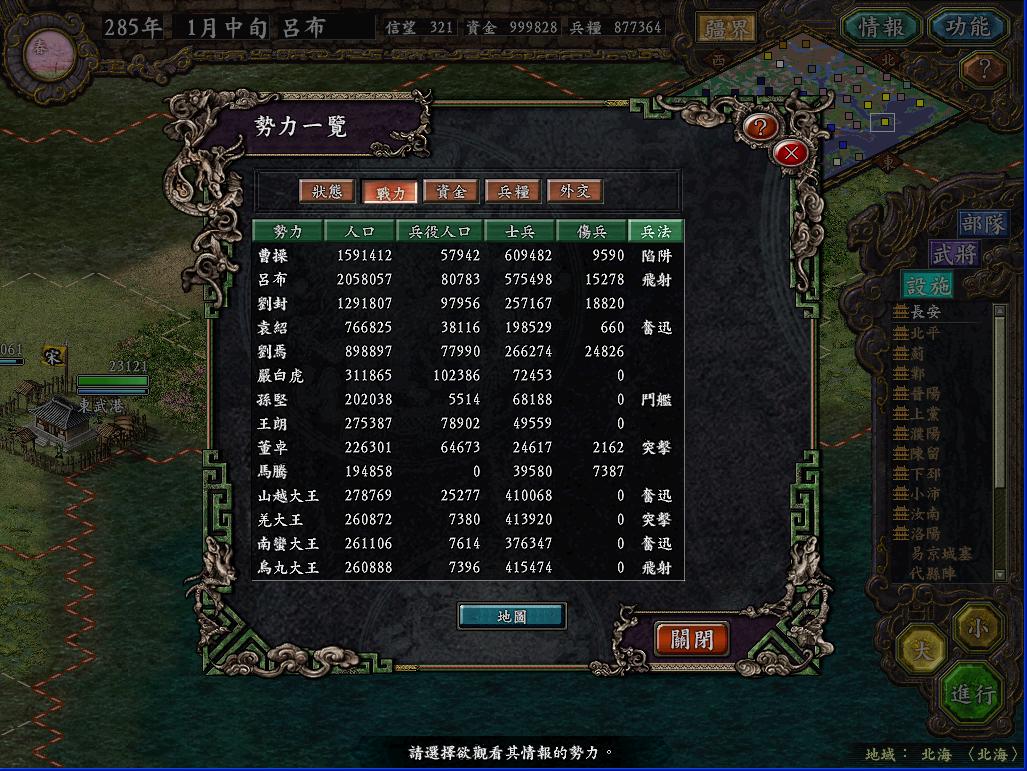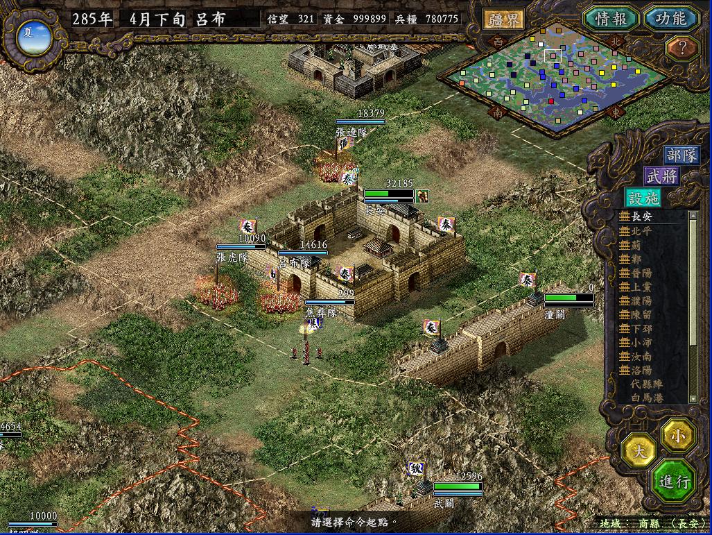 那个长安之战当时玩的时候,总是不由自主的想起汉中剧本那种三面夹攻的情景,如果敌军同时攻打我两个城,我就根本没办法从周围地方送援军过去(人手不够,守城都勉强凑合),而且守城的时候一个城最多留下7个将(两个城都在打,如果每个城8个将以上的话,另一边就没法守了),这样7个人还要有一个守城,6个人最多出两队,对付人家8,9队乃至十几队的攻城部队,实在是不好打。