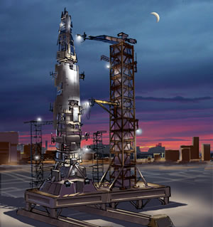 One of the more interesting pieces of concept art I was asked to create for Civilization IV: Beyond The Sword is the new spaceship design (the result of a Space Race victory). It was to be a ground launched, very large vehicle capable of carrying several hundred passengers (and tiny bags of peanuts) to the next planetary system. For something like this, a bit of research goes a long way. It's fairly easy to research a concept that's based on existing technology; such as a spaceship, vehicle or building. I looked at the current state of spaceship design and technology, then tried to project where it might go in the future. Incorporating what I learned through my research into the design of my spaceship gave the "look and feel" some credibility. One consideration in a ground launch rocket was good aerodynamic properties and tremendously powerful engines in order to breach the atmosphere. If it were built in space and only traveled in space, it could be shaped like a brick. I submitted three rough drawings that I thought captured what we were looking for, and one was chosen. From there, I began to mock up the in-game spaceship building screen where the player can keep track of the construction of their craft (starting with a skeletal frame), and know what is still needed as the game progresses. Again, I used current airframe design as a basis for how the frame of the ship should be built. The end result is a very believable futuristic kick-in-the-pants spaceship.