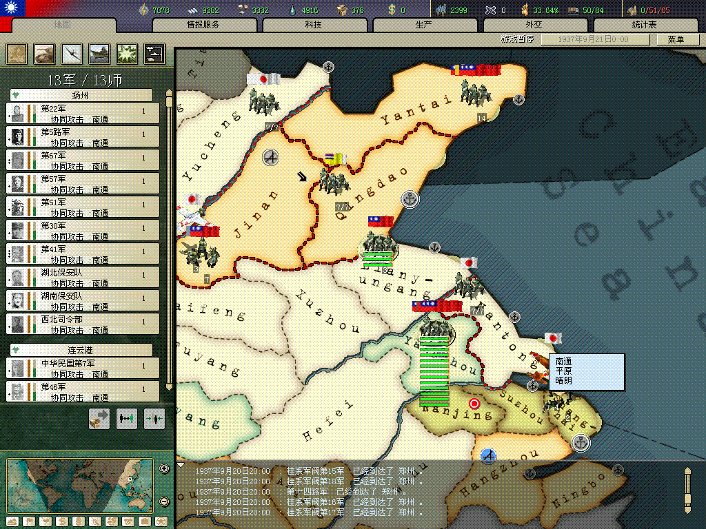 济南开封沦陷,日军在青岛,南通登陆。我军对南通之敌实施合围。另用到达郑州的军队夺回开封。济南合围青岛之敌。