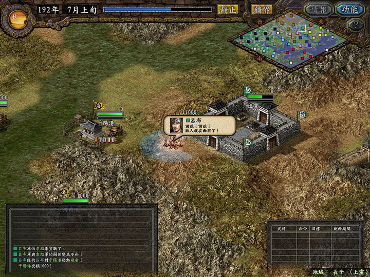 我吕布带了11000是全上党的兵了,一出来就发动飞射,平阳内的1000守军直接杀完,我的11000没损1人进驻平阳