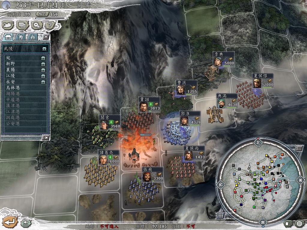 251的刘备。人多,发展了半年之后南北2线开战。搞定刘表之后。赵云6000骑兵直开新野。没想到宛的胡车儿比我快1步,先把新野占领了。奋战之后终于枪了回来。一路直杀到宛。城市都没攻下,只有2个城市的曹阿瞒就向新野下手。防不胜防。发疯了向新野冲。最后在S/L大法和单条后终于等到了支援的2万人到来。我抓到了他的典韦 夏侯渊 苟攸 和郭嘉。但是我的百出马谡被曹操抓了。没办法。拿典韦去换。熬了半年。夏侯和苟攸都跑了。郭嘉还在张飞队里。