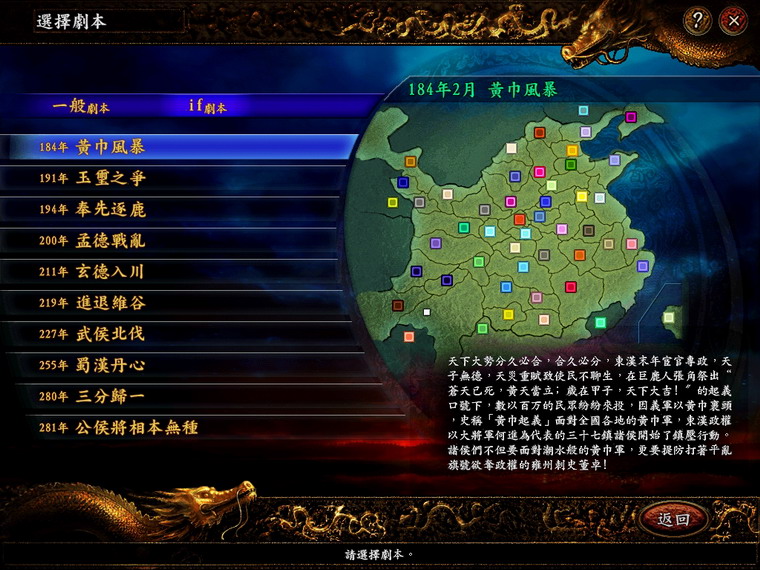 三国历程系列剧本是按三国的发展史,略做压缩而做,按年代一共做成9个剧本