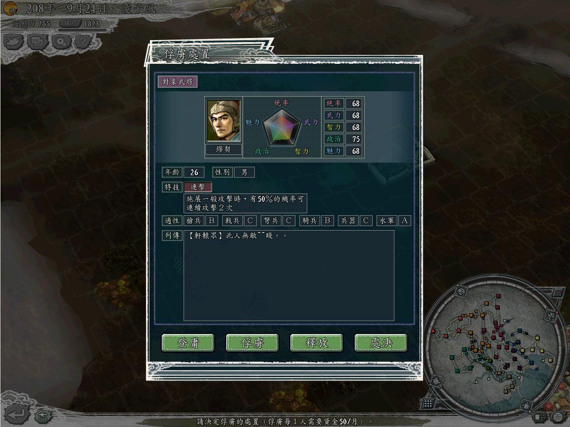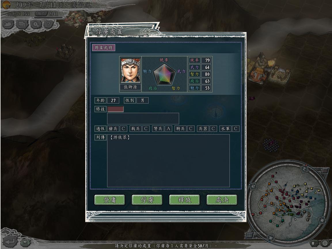 仔细盘点敌军进犯之敌人.靠!还有个7百多人的MM冲车队 而且还带着个俘虏来...此俘虏是刘猿猴军的英雄刘备,看忠诚度已经掉到93了.
