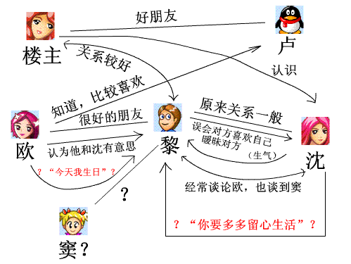 黎和沈是因为了卢在美国时候和她谈起,对他产生好奇,而且他在朋友圈(这个圈包括欧)口碑很好,便就是在网上有些交流,算是朋友吧(我和黎也是通吴认识的,不过关系和比沈和他要好,他们只是比较在网上说话,平时很少见。我和他经常见。同时欧也知道卢,但不熟悉,不过很喜欢这个人)当然,之前也是交流得比较朦胧一点,而欧一干朋友也就是八卦开些玩笑,导致黎对沈有些误会吧,误会沈对自己有好感(因为他敏感)。然后他们就一起玩播客。(包括黎、沈、欧)。然后到了一年新年,黎在播客发了一堆话去给两个人祝福。其中对沈的话里有些表达爱意的暧昧词,但是非常暧昧不清。不过正常人看了以后还是能看得出来。然后沈表现得很生气(1)。后来黎也发现整件事呢,也就是朋友之间的八卦误会,导致双方误会。后来沈发现自己也被八卦弄晕了, 到最后两个关系也算正常。