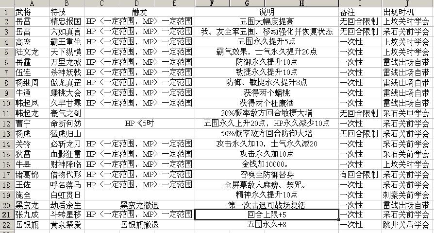 岳雷六如真言特技已做于雷线第六关.其余18特技设定如附件.