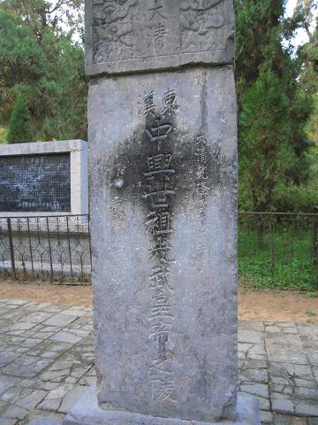 初来乍到,抬眼就是两根高大雄浑的看门柱,仿造的~汗——#,举步向前,左右两旁为林荫小道,中间为宽阔的鹅卵长甬(真的很长)--这是外陵到陵园门口之间长长的神道,道两侧立有石像石人石马,那是古代帝王陵享有的待遇(鼓掌~~~),顶着烈日我与朋友步行至景区入口(汗出如浆,忘带伞了)。