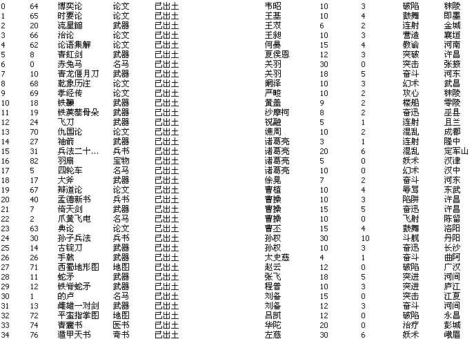 所有宝物现在都有附带兵法,武力类兵法均为2级兵法,其他类型兵法适当做了分配以增强宝物的实用性(图中只是已经出土的宝物,其他的都需要探索)