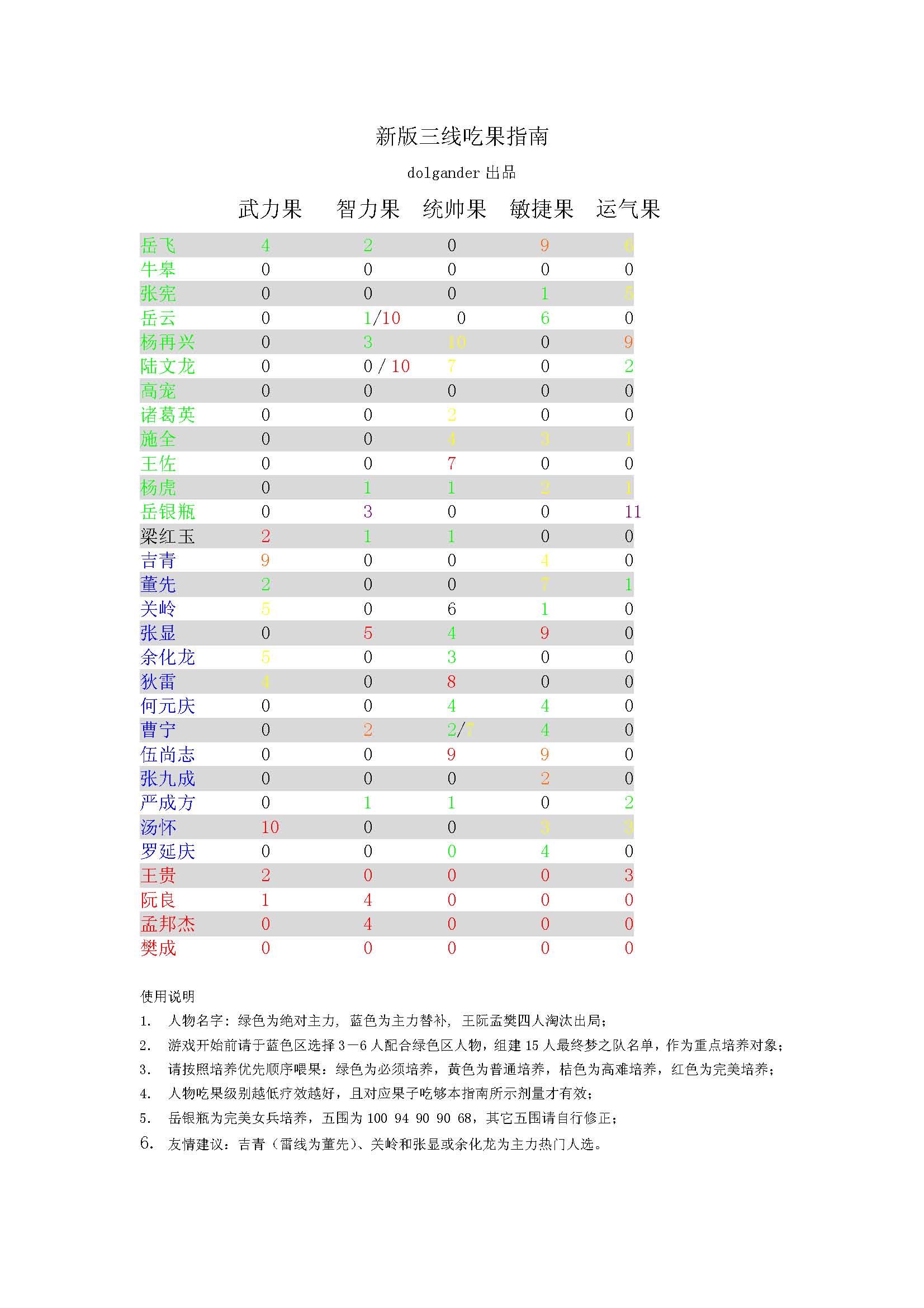 对于许多新人来说,吃果子是个头痛的事情。本人试图给个简单直观的表格,你不需要去搞清那个‘复杂’的理论,不需要知道人物的具体数据,只要按说明,选定你喜欢的人物后,按自己能力,选择性培养你的主力名单。对于有竞争性需要的人物,你要有选择性,如武力果,除岳老大必须外,吉青、余化龙和关岭全面培养难度非常大,你必须放弃其中1-2人。