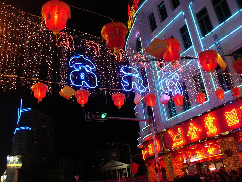 这是在中山路步行街上的拍的舞龙队和装饰一新的灯笼街