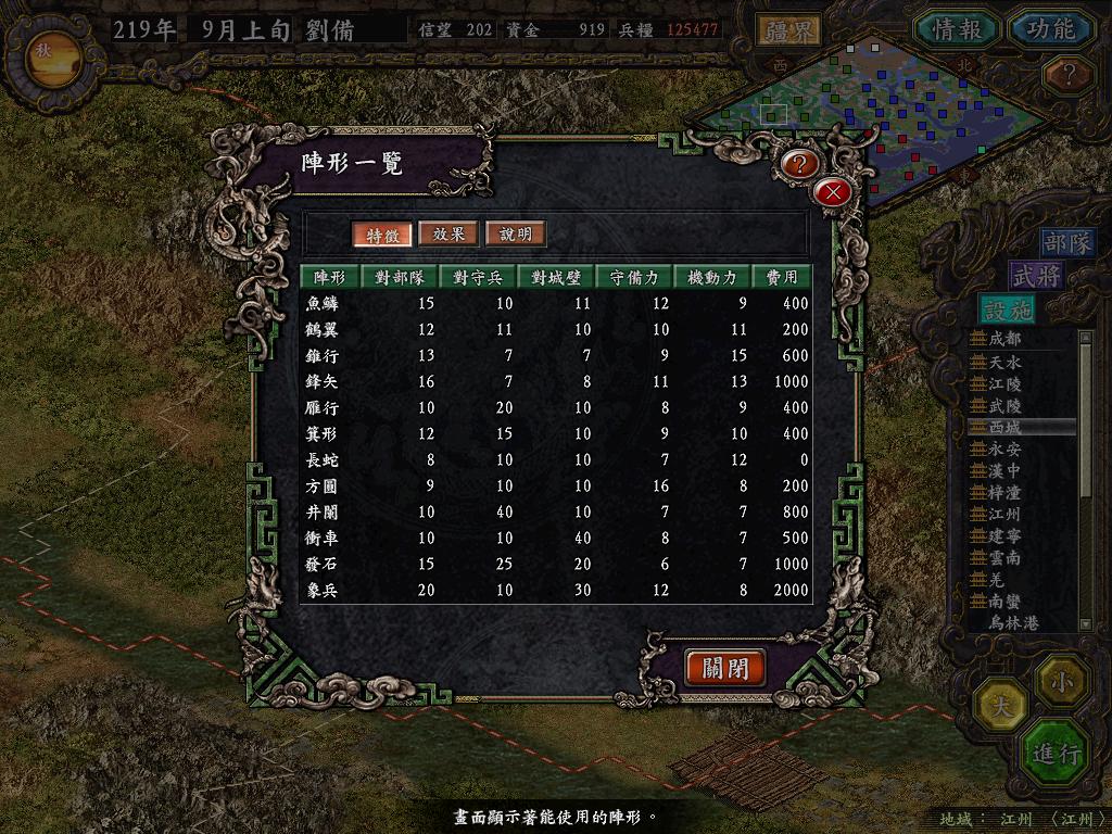 蜀国动向:蜀国保守成性,完全不提倡武侯雄风,在魏国大举南下之时,竟然不趁机牵制出兵赚取油水,反而训练巡查.上庸部5W人待机一回合,若起水陆2路大军,关羽,蒋碗分进合击,以信望10天加优势兵力一点突破隆中,魏主必收回湖羊之兵.江陵之众仅起兵2W(一建一步)逼近汉津,守军3K,巡逻6K.由于南征,吴国柴桑无力攻打乌林.乌林1W8的黄忠没有北上,选择继续防守.除江陵出兵,其余各地平静.