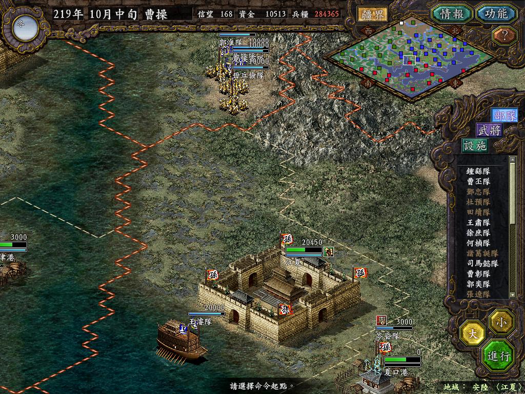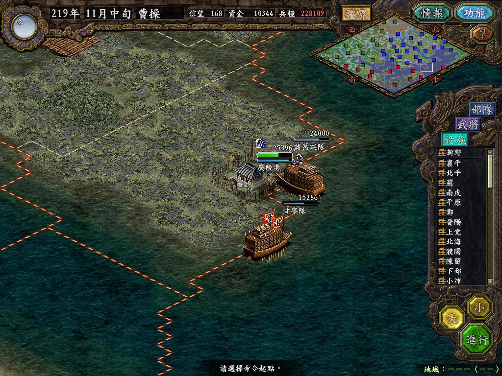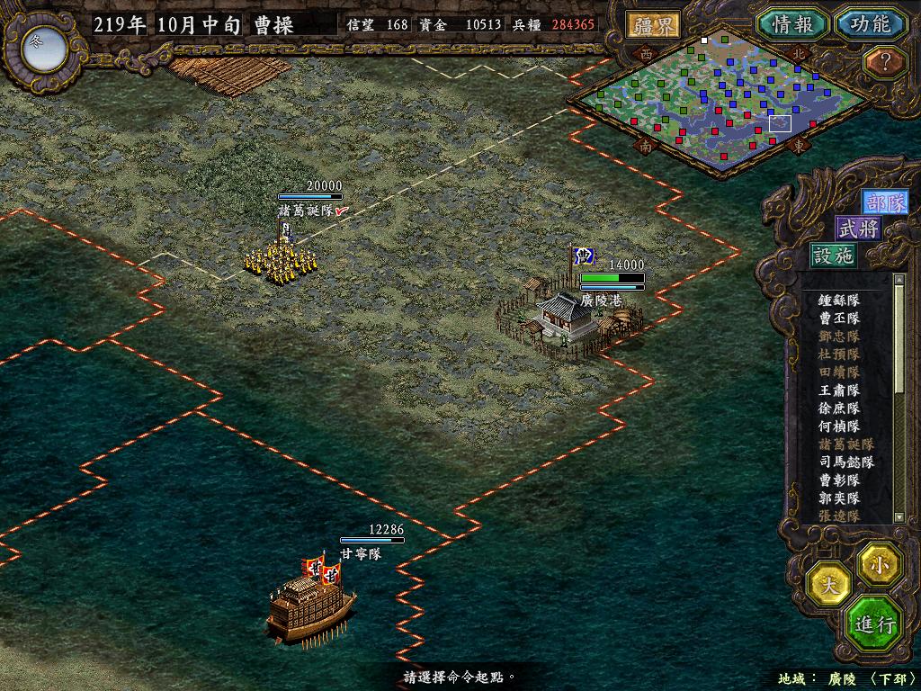 步入10月中旬,魏主调整各部阵行,鉴于上庸压力,估计编鞋小儿明日就要出击,故昨日已将襄阳水军部调驻隆中,今日决定反客为主,主动出击,打乱敌人预定计划.杜预领武将3人以斗舰用完了最后的1000金,1W7出击上庸.襄阳空虚的只有3K,隆中最后的防线2W,实在担心江陵5W乌林1W8北上.