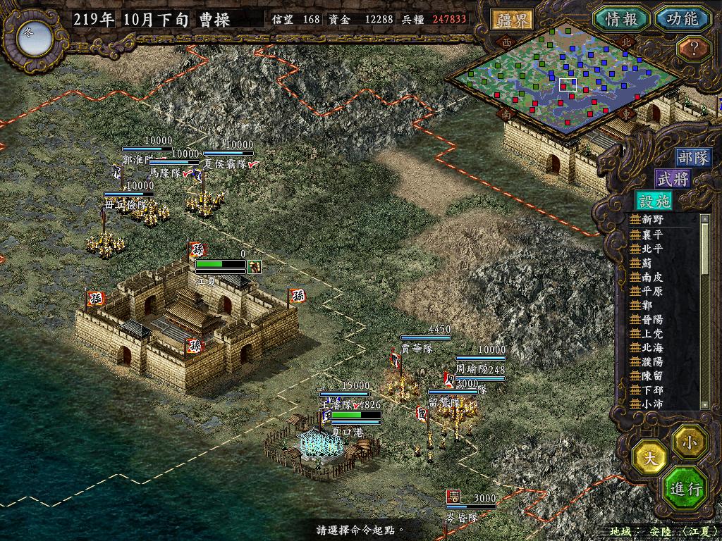 武运昌隆!自草鞋小儿自立汉中王来更贪得无厌,直接称帝,随即吴魏相继称帝.LM高唱"五虎在手,天下我有!"GB海盗日益猖獗.扬言:"港!都是吴国滴!"魏主面对两家嚣张的气焰,不为所动,任尹大目为丞相,曹熊为伐吴大将军.第一天就下达命令,该巡查的巡查,该征兵的征兵,亲自坐镇许昌督战,由于河北军房规,魏主不再像过去主攻了,现在的重要战略目标是要孙刘在武陵和江陵开战,而自己一方面不要在前线太多兵力,以防给两家造成压力.