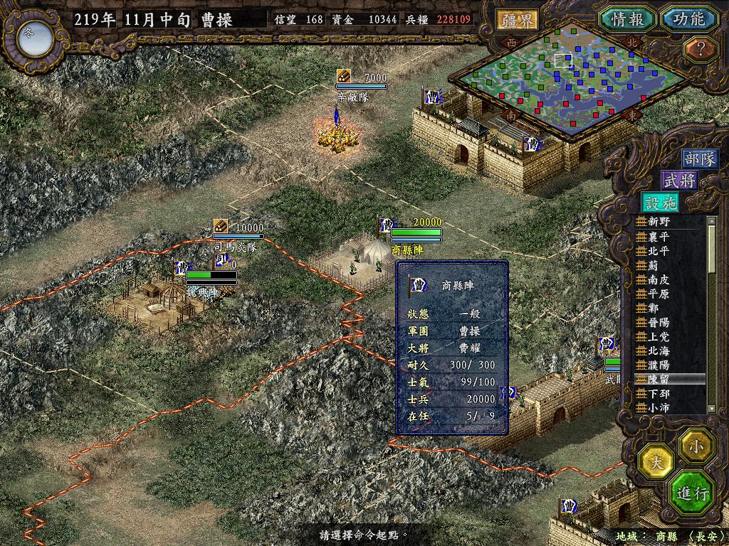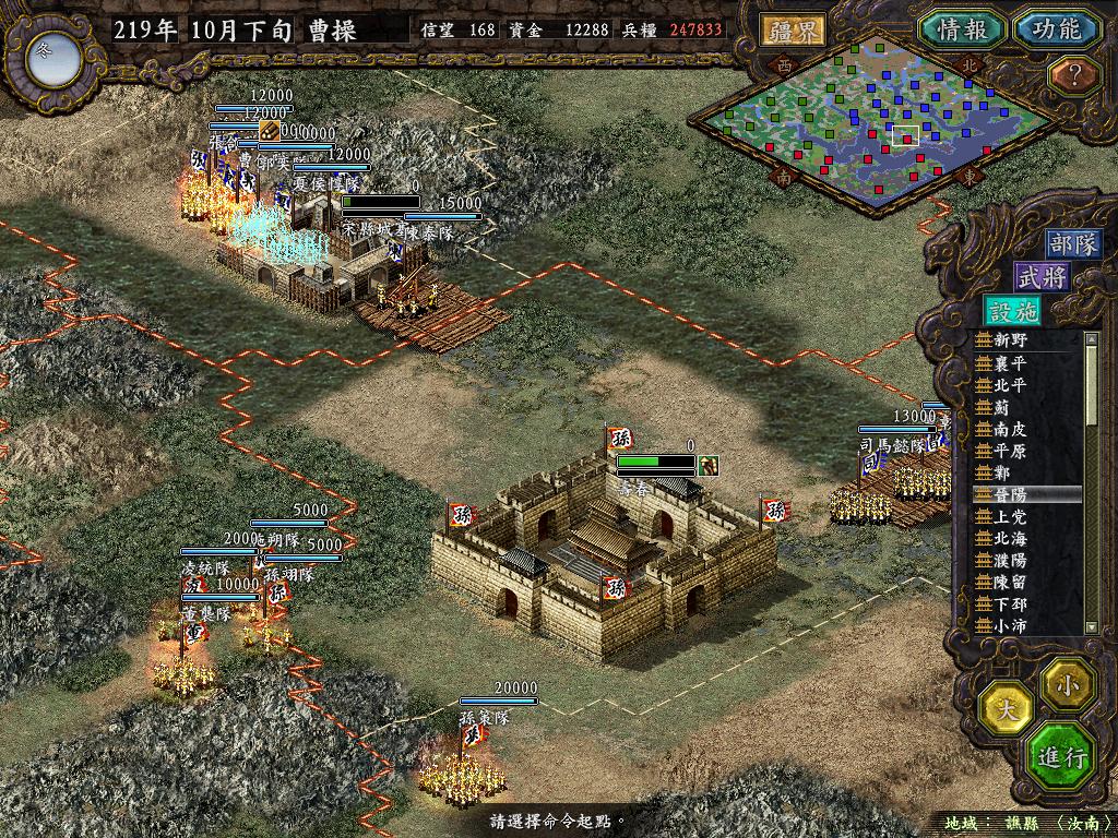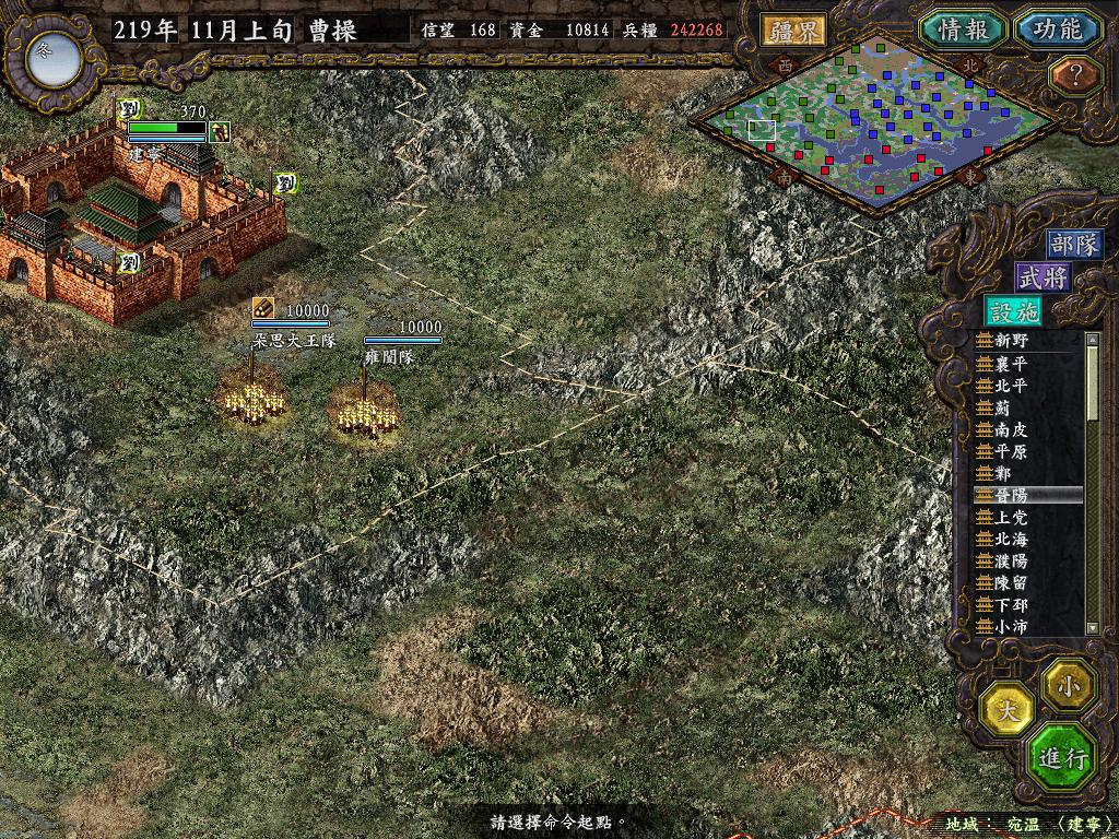 为了准备战役,隆中,新野兵力只有基本守备队,和威慑性的武将镇守,所有预备队都用完了.等待北方2W的丕儿赶到.