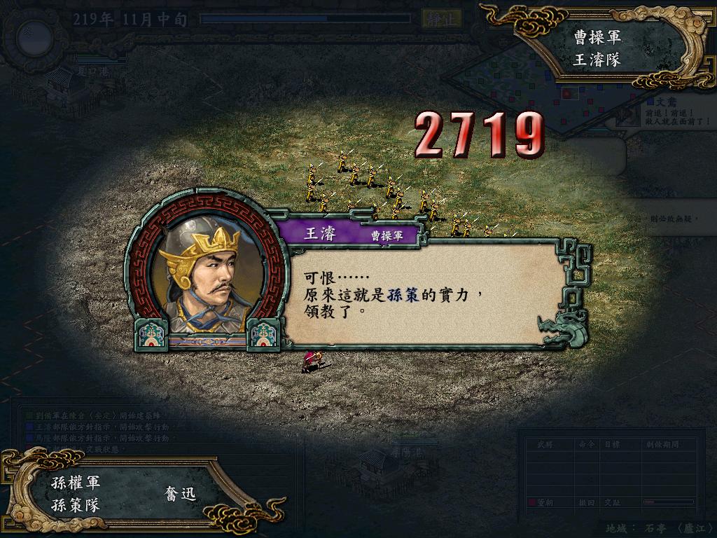 十一月下旬行动:魏国全力向寻阳进军,期待能追杀吴国败军,顺路拿下卢江,只留王睿及夏侯霸等弓骑攻城,张辽夏侯淳等重兵急行军,此旬真他妈杀的天昏地暗啊,完全看不清谁和谁打,吴国依然和上旬战略一样,攻港两队,其余鼠部随后,策单独牵制.张昭2W3援军在港外夹攻.藏霸啊!~~实在救不了你了,藏霸竟然大喝:"来来来!叫你们吃不了兜着走".感动啊!曹公会厚葬你的.卢江3门都在开战,由于魏国兵力太有优势,故不再祥述期间兵法.