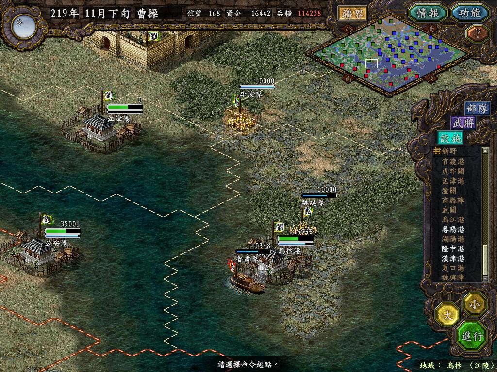 图3:上庸关羽已撤回西城,准备参加张飞的生日PARTY.上庸空虚的他妈不行了,严重怀疑蜀主是否放弃之?杜预领帝国水军向西巡逻,任务为攻击蜀军商船,赚回出征的1000元费用.上庸已有陆水军6W5.