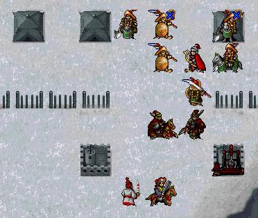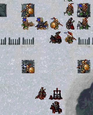 2.张九成装备踢雪马,一开始就饶过金母猪冲进最上面金营的最后边在防御,这样的话就只有一个弓骑来攻击他,不会构成威胁.(有截图)