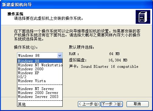 选择操作系统,我们当然是选择windows 98,然后下一步,