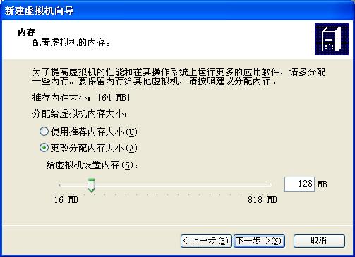 这里我们可以选择使用的内存大小,如果你电脑的内存大于512M的话,建议指定为128M,