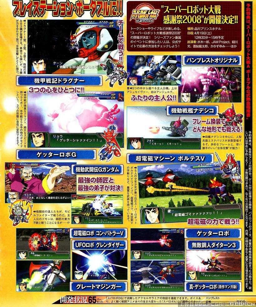 BANPRESTO 于本周的日本电玩通(FAMITSU)杂志中发表,将于 6 月推出 PSP 策略角色扮演游戏《超级机器人大战 A 携带版(スーパーロボット大戦A ポータブル)》。