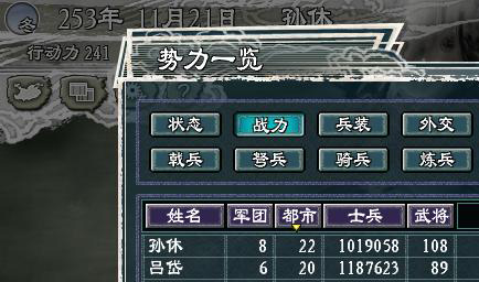 其实很早开始就没有再玩311了,感觉到了后期太麻烦,简直是浪费时间,不过一直没有统一也让我心有不甘,所以干脆让电脑自己去打,结果选择孙策一直打到孙休,现在两个势力已经时过境迁,看看吧,双方的武将都死得差不多了,胜负只在寿命之间了