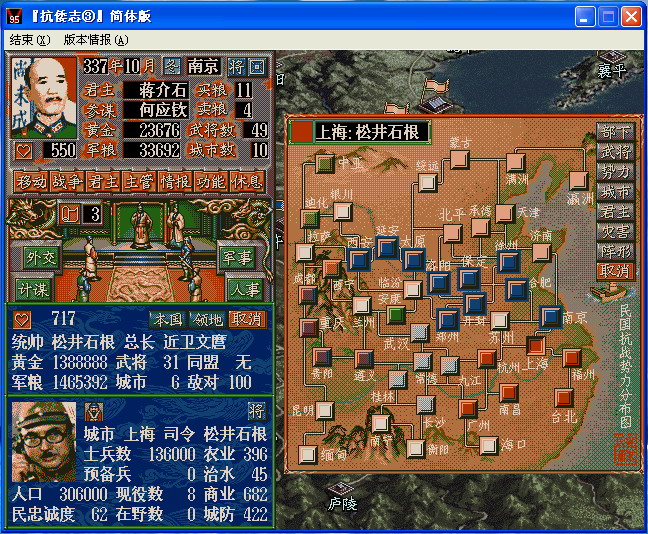 3、主画面(一级窗口)按钮文字以图标名显示,暂时没法修改,所以显示的仍是原35文字,包括剧名和城市名等。弹出画面(二级以上窗口)对象参数以文本框文字显示的,则为抗倭志的正常设置,如弹出窗口的城市地名等。此外,战略态势图的城市旁边标注了地名,以方便玩家情报分析。
