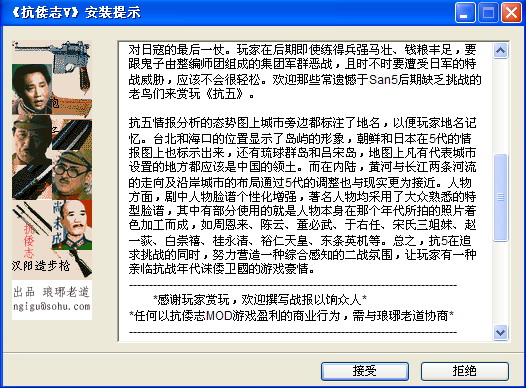 1、本套剧本改编自《三国志五简体中文版》,免CD,可在9x/2k/xp/2003上执行(画面256色)。需光驱,虚拟光驱也行。不需安装,不写注册表,解压后即可游戏,直接运行《抗倭志.exe》。