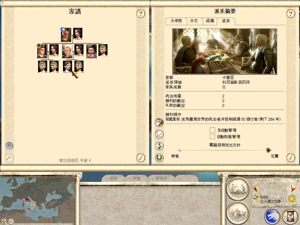 很明显,西庇阿家族的第三个儿子是个人才,如果选择他的做扮演对象的话,将会很有代入感。至于老头子、大哥,自然是让敌人杀掉算了,至于那些小的就留着吧。怀着这个想法,我试图攻下叙拉古(1.1是叫鸠XXX,很古意的城名,当时我是打算将之发展为首都的),然后让老头子在墨西拿被敌人端掉。可惜的是,当时玩的是1.1版,家族首都卡普亚敌人根本不来打,只能提税让乱民占了,守卫的将领也不会被杀掉,浪费了一此害人的机会,原定的那个世继怎么弄死得多费许多心机(直接改变继承人的话,就没意思了,还是让这家伙一死百了吧。)