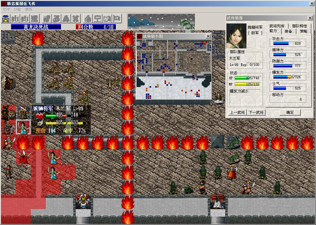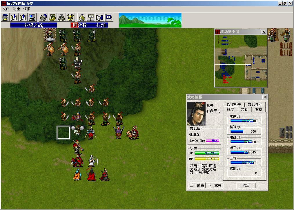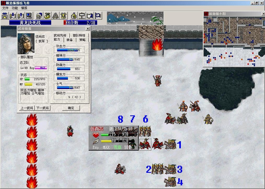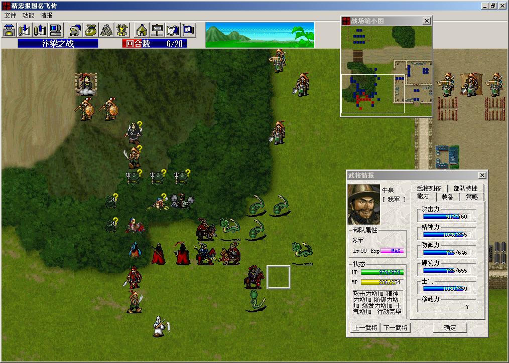 俺的方法是高宠单击(一定不能双击)5号拐子马,老牛吹它一下。伍尚志原地干啥都行(就是不要补血)。这样敌方回合王贵虽然会被反击一下,但是张显却会右移一格杀掉5号拐子马,从而挡住7号拐子马对王贵的攻击点。