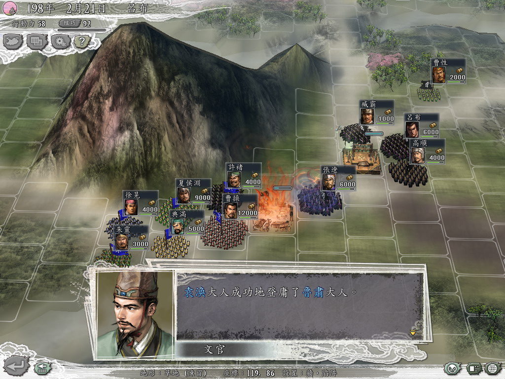 1月1日,呂布聽從陳宮計策駐小沛,將兩城登庸兩城隱藏武將、曹性2000弓向陳留進軍。