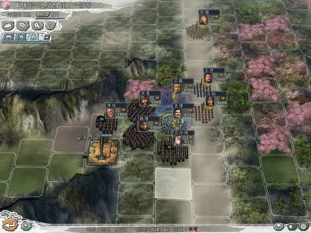 2月1日,張遼隊在陳留主徑(117,85)建陣,呂布隊修補,高順隊在陳留主徑(119,83)建軍樂台,曹性修補。呂玲绮隊在