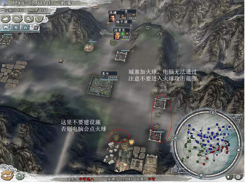 上庸方向建两个阵加火球,利用阵的ZOC和AI不攻击火球(除非我方进入火球攻击范围),电脑再多人马也无法通过,只需派人修一下阵即可