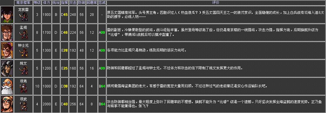 名称 势力 攻击 防御 回避 移动 射程 指挥力 生产条件